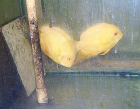 | Some fish pair up with a mate they keep for a long time. The female of this pair lays eggs on the piece of tile you see leaning against the glass, to the left. |