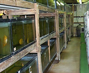 In a fish "nursery" eggs are hatched, then moved to larger and larger tanks where they can grow. The ones to the left are a beautiful shade of blue. |